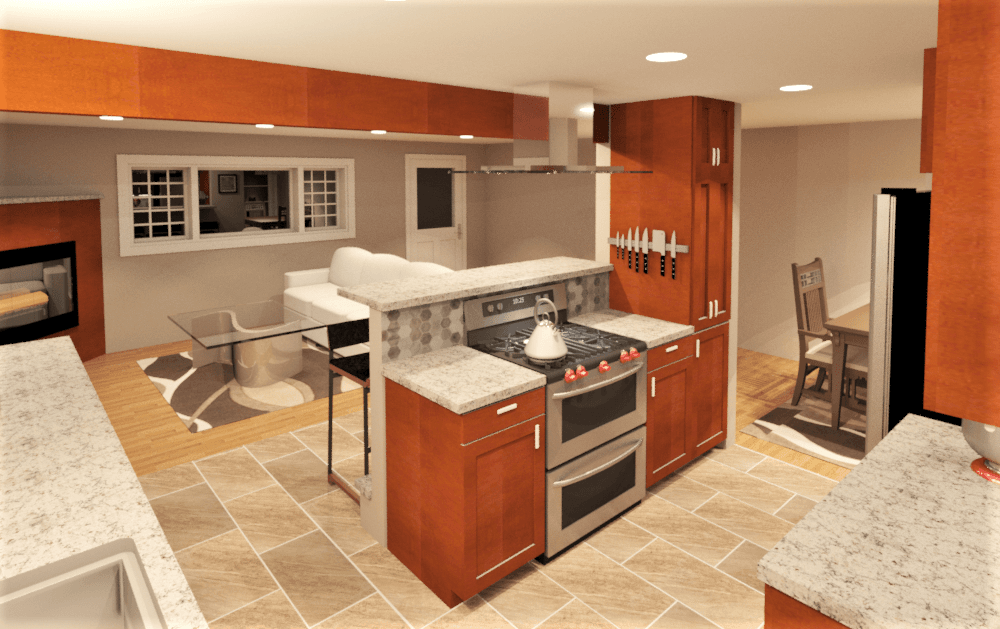 This kitchen remodel is a perfect example of being able to update an older home. We decided to take down an existing wall to open up the kitchen to the living room. The accented dopped beam over the kitchen adds to the architectural appeal, and an expanded kitchen with cherry cabinets, granite countertops, and ceramic tile backsplash give the finishing touches.